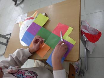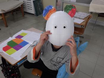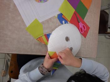 2年生図工「かぶって変身」 お面のデザインが始まりました。カラフルなシールを切って、お面にはっていきます。