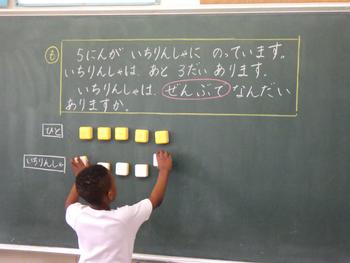 1年生算数「たし算とひき算」 各自が考えたことを発表です。黒板を使用して、友人に説明します。