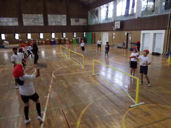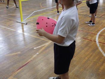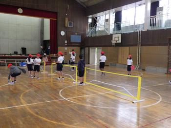 3・4年生体育「テニピン」 テニスを簡略化したスポーツです。手にスポンジ製のラケットをはめてボールを打ちます。