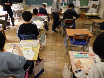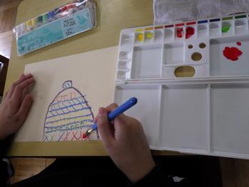 なかよし学級図工 題材は「雪の日のぼく・わたし」です。毛糸の手袋や帽子をかいて、彩色です。