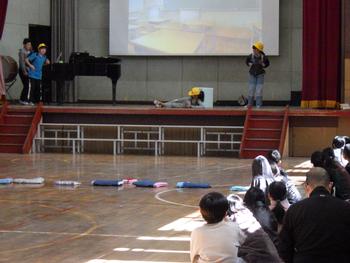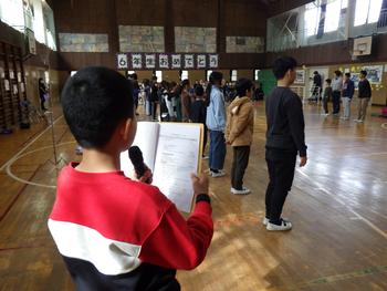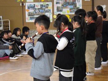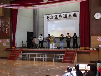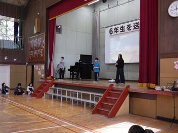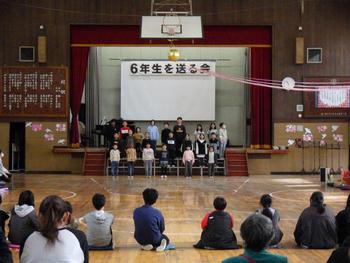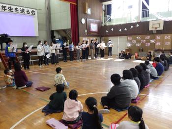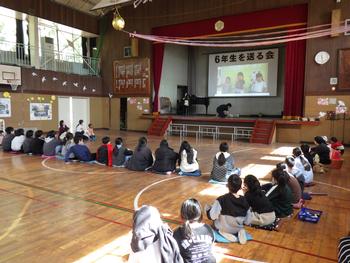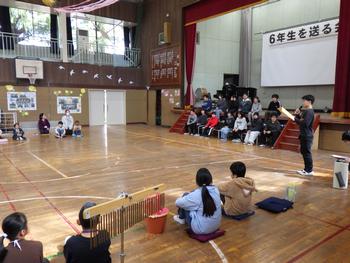 送る会③ 1~5年生の発表です。6年生の各学年の思い出を劇や楽器の演奏などで披露し、歌声で感謝の気持ちを示しました!