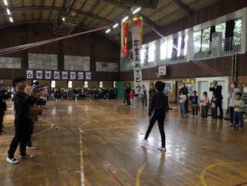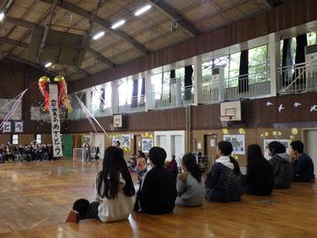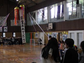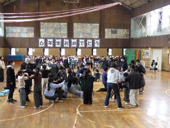 送る会⑦ 「6年生を送る会」のフィナーレです。6年生に向けたくす玉を割り、「卒業おめでとう」の言葉の中、しっかりとした足取りで6年生は、退場していきました。