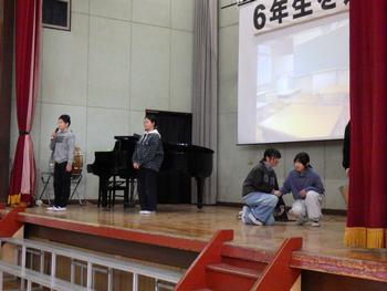 送る会⑥ 6年生の発表です。寸劇で入学から今までのエピソードを紹介し、思いを込めた歌声です。6年生の「ありがとう」の気持ちがたくさん届いてきました‼