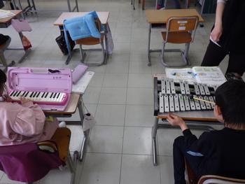 1・2年生音楽「みんなで合わせて楽しもう」 ハーモニカやトライアングルなどを使用して、曲を演奏です。