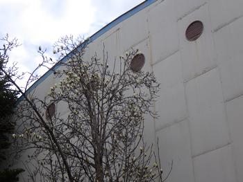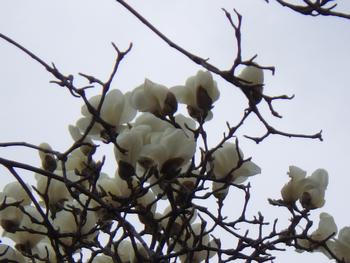 体育館横のハクモクレンが開花しました。曇りのため、よく見えませんが、数輪、花を開かせています。