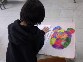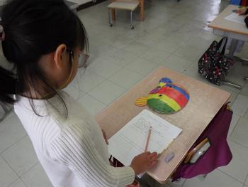 2年生図工「かぶって へんしん」 友人の作品を見る鑑賞会です。工夫している点などをメモします。