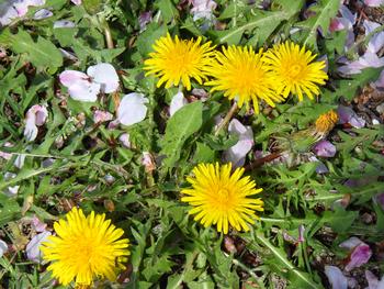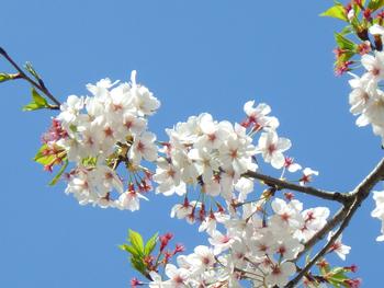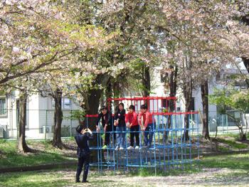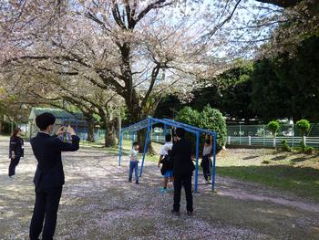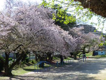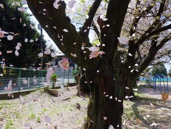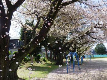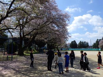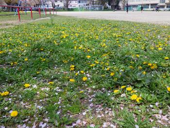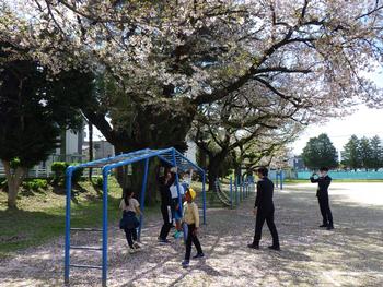 校庭では、たくさんの春を見つけることができます。桜は、さくら吹雪の時期へとうつろいつつあります。