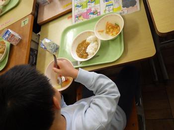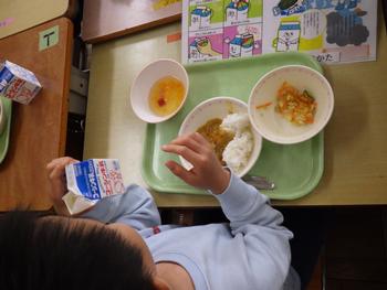 1年生も今日から給食です。1年生にとって初めての学校給食はカレーライスが中心でした!