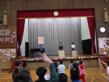 1年生を迎える会① 1年生が6年生と一緒に入場しました。2年生からは、プレゼントが送られました!