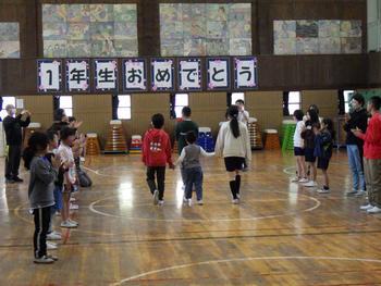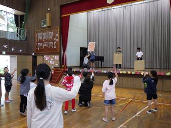 「1年生を迎える会」を行いました。全校児童が体育館に集まり、常一小の仲間に加わった1年生をあたたかく迎えました。会は、6年生が1年生を紹介し、全校レクで楽しむ時間をとりました。「迎える会」に全校レクができるのは、常一小だからこそです。全員が常一小の仲間であることを感じることができた会だったと思います。「迎える会」は、児童会役員のみなさんが中心として活動しました。役員のみなさん、ありがとうございました。