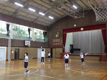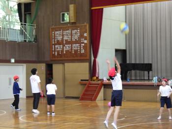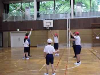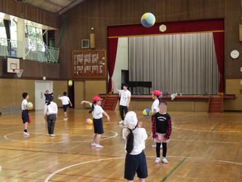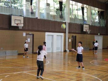 3・4年生体育「ボール運動」 ボールをできるだけ高く投げます。体育館の屋根近くまで投げ上げる子がいました!