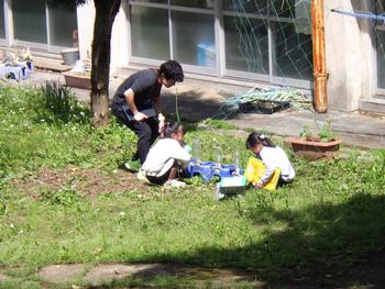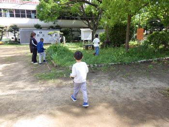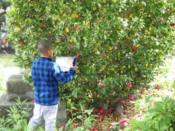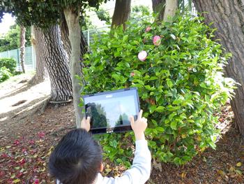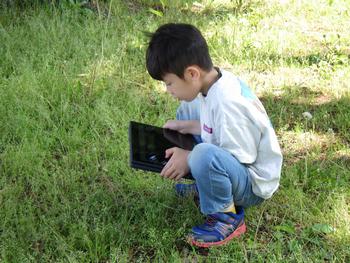 1・2年生生活「春を見つけよう」 校庭で春をさがしました。見つけた春は、タブレットで撮影です。