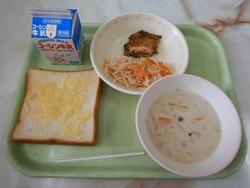 蜂蜜とチーズはベストマッチ! クリームスープにほっこり… 蜂蜜チーズトースト・牛乳 チキンのバジル焼き・春雨サラダ きのこのクリームスープ |