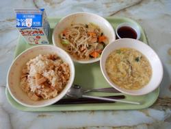 今日は中華だ! 野菜たっぷり! 中華おこわ・ハム野菜炒め 中華コーンスープ・牛乳 ぶどうゼリー |