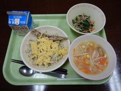 野菜の旨味とほのかな甘み ほっこり温まるスープです! 野沢菜チャーハン・ナムル シシャモのゆかり揚げ・牛乳 ジャガイモスープ |
