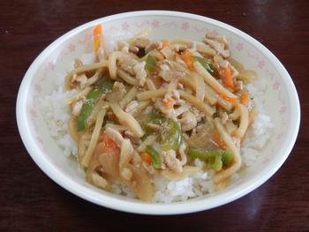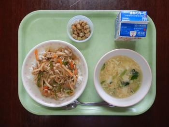 「チンジャオロースー丼・かに玉スープ・ポップビーンズ・牛乳」