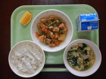 「ごはん・高野豆腐の揚げ煮・かきたま汁・オレンジ・牛乳」