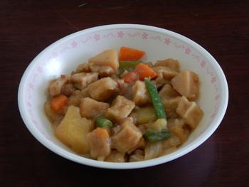 〇高野豆腐の揚げ煮は、高野豆腐・とり肉・じゃがいも・たけのこなどが入った具だくさんです。高野豆腐をはじめ、出汁のきいた甘めの煮汁が具にしっかりと伝わり、ごはんが進みます。また、歯ごたえのあるたけのこと、やわらかなじゃがいもなど、食感の違いを楽しむことができます。かきたま汁は、ときたまごがなめらかです。