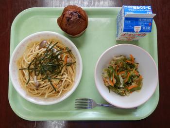 「和風スパゲッティ・くさわかめのサラダ・チョコカップケーキ・牛乳」