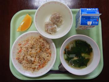 「キムチチャーハン・しゅうまい・うずらたまごのスープ・オレンジ・牛乳」