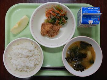 「ごはん・とり肉のうめしそカツ・なめたけ和え・じゃがいもとわかめのみそ汁・りんご・牛乳」