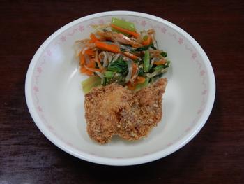 〇とり肉のうめしそカツは、ころもがカリカリです。パン粉に、うめぼしや、ゆかりを混ぜています。ほんのりと漂う梅干し入りのころもが、とり肉のおいしさを包んでいます。なめたけ和えは、みりんなどで軽く味をつけてあるため、素材の旨さを味わうことができます。なめたけの柔らかさと、もやしや小松菜のシャキシャキ感、食感の違いも楽しむことができます。
