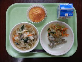 「かきたまうどん・めひかりのカリカリ揚げ・からし和え・米粉のマドレーヌ・牛乳」