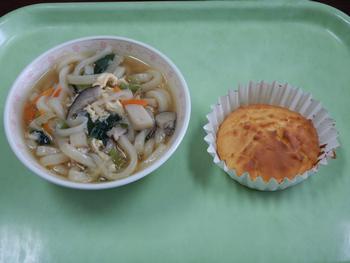 10月23日(木)の給食 かきたまうどん・米粉のマドレーヌ