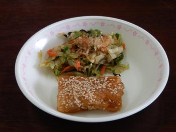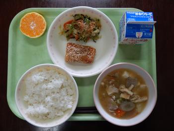 「ごはん・いかのかりんとうがらめ・キャベツのこんぶ和え・とん汁・みかん・牛乳」