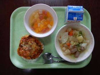 「手作りピザパン・ポトフ・ゼリー入りフルーツポンチ・牛乳」