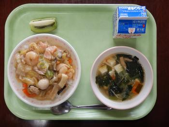 「中華丼・ワカメスープ・キウイフルーツ・牛乳」