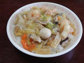 〇中華丼は、具だくさんです。白菜・たけのこ・干ししいたけなどの野菜に、うずらたまごや海鮮が入りました。甘めのタレが具をしっかりと包み、ライスがどんどん進みます。大きめのえびはプリプリでした。ワカメスープは、出汁のおいしさがきいています。さらにスープに、具材の旨味が加わりました。