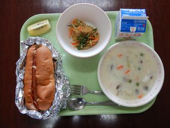 「ホットドック・クリームシチュー・大根サラダ・キウイフルーツ・牛乳」