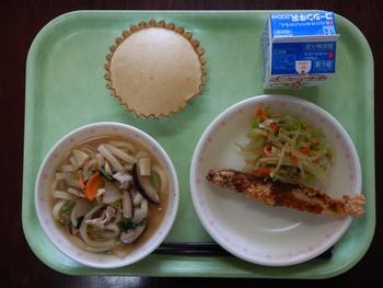 「みそ煮込みうどん・ししゃものフライ・こぶちゃ和え・きなこ蒸しパン・牛乳」