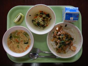 「ぶたキムチ丼・わかめサラダ・中華コーンスープ・キウイフルーツ・牛乳」