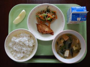 「ごはん・さばのソース焼き・なめたけ和え・生揚げのみそ汁・りんご・牛乳」