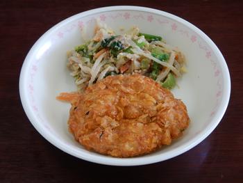 ○かりかりがんもは、自慢の手作りです。コーンフレーク入りのころもが、やわらかくて厚みのある具を包みました。名前の通り、表面がカリカリです。豆腐にツナフレークなどが入り、味わい深い一品です。ごま和えは、甘くしたみそに、たっぷりのごまを和えました。みそ汁は、だいこんや油揚げに、みそのおいしさがよくしみていました。