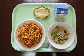 ○スパゲッテイナポリタンは、もっちりとしたパスタにソースがよくからみ、トマトのおいしさを味わうことができます。ぶた肉・ハム・マッシュルーム・たまねぎなどが入った具だくさんでした。じゃこサラダは、野菜にカルシウムが加わりました。酢で味付けをしたさっぱりサラダです。スイートポテトは、常一小自慢の手作りです。ふんわりとした焼き上がりで、しっとりとしてなめらかな食感です。甘さがひかえめで、さつまいもの素材のうまさを楽しむことができました。2学期の給食提供は、明日が最後です。
