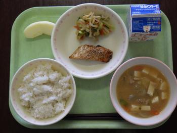 「ごはん・さばのごま焼き・野菜の梅和え・とん汁・りんご・牛乳」