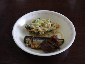 ○いわしの甘露煮は時間をかけてじっくりと煮こんでいます。甘めのたれをたっぷりと含んで、骨までおいしくいただくことができます。ごま和えは、ごまの香ばしさを味わうことができます。みそけんちん汁は、ごぼう・だいこん・じゃがいも・とうふなどが入った具だくさんです。みそと野菜のおいしさを楽しみました。