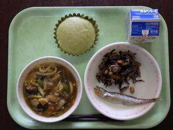 「カレーうどん・焼きししゃも・ひじきの煮物・抹茶蒸しパン・牛乳」