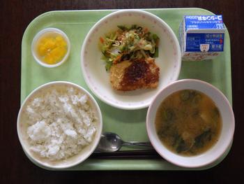 「ごはん・いかフライ・キャベツのこんぶ和え・ぶたじゃがみそ汁・ももゼリー・牛乳」