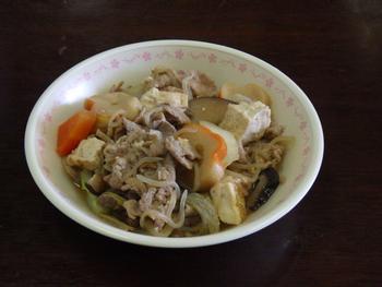 ○「節分」にちなんだ献立です。すき焼きは、ぶた肉・焼きどうふ・白菜・しらたきなどが入った具だくさんです。たれは、具の旨味が加わり、おいしさが増しています。肉がたっぷり入っていることが嬉しいです。ハリハリづけは、甘酢で味付けをしたさっぱりサラダです。切り干し大根がシャキシャキです。いりだいずは、カリカリで香ばしさを感じます。