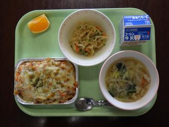 「チキンドリア・大根サラダ・野菜スープ・きよみオレンジ・牛乳」