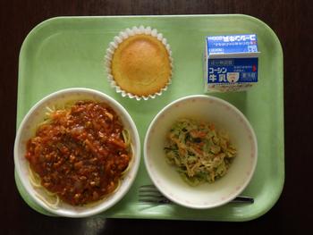「スパゲッティミートソース・ごまドレッシングサラダ・米粉のマドレーヌ・牛乳」