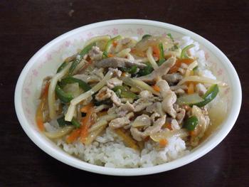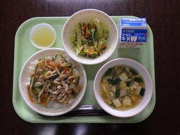 「チンジャオロースー丼・茎わかめのサラダ・にら玉スープ・パインゼリー・牛乳」
