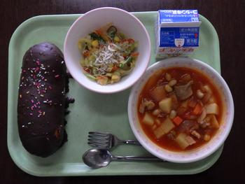 「チョコつきパン・ポークビーンズ・じゃこサラダ・牛乳」