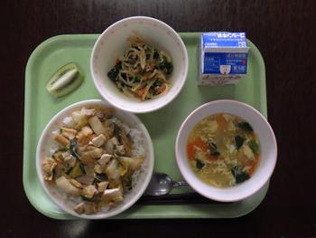 「ぶたキムチ丼・ナムル・中華コーンスープ・キウイフルーツ・牛乳」