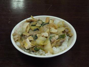 ○今日は中華風の献立です。ぶたキムチ丼は、ぶた肉やキムチを中心に、たまねぎ・はくさい・生揚げ・あさりなどが入った具だくさんです。キムチの酸味、ほど良い塩加減、にんにくの旨さがおいしさを引き出しています。ナムルは、ごま油がきいています。もやしや小松菜のシャキシャキ感を味わいました。中華コーンスープは、とろみがあり、甘味のあるスープです。