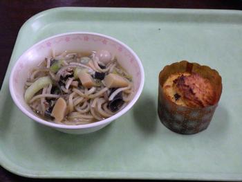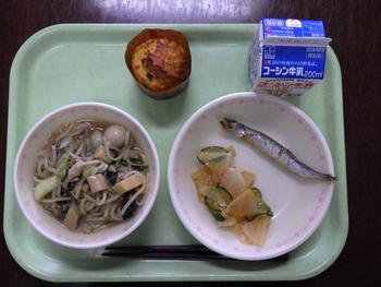 しょうゆラーメン・焼きししゃも・ごまきゅうり・おからカップケーキ・牛乳」